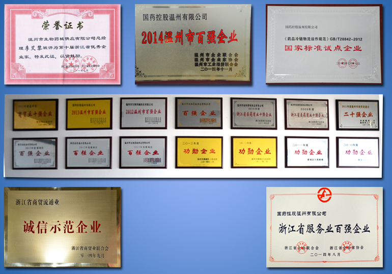 2014年被評(píng)為浙江省重點(diǎn)流通企業(yè)、浙江省服務(wù)業(yè)百強(qiáng)企業(yè),浙江省商貿(mào)流通業(yè)誠(chéng)信示范企業(yè),《藥品冷鏈物流運(yùn)作規(guī)范》GB/T28842-2012國(guó)家標(biāo)準(zhǔn)試點(diǎn)企業(yè)李艾黎總經(jīng)理榮膺2011年浙江省優(yōu)秀企業(yè)家稱號(hào)